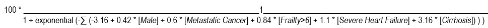 A patient’s overall risk of escalation for each combination of risk factors is shown in Table 6, with 95% confidence intervals (CI). If a patient had all five risk factors, his risk of escalation was 95%. A patient lacking all risk factors (i.e. a female without severe heart of liver disease, metastatic cancer or frailty) had only a 4.1% risk of escalation.