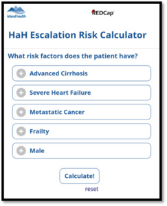 We subsequently created an escalation risk prediction tool for the Victoria HaH Program. This tool has been incorporated into clinical practice in several ways. Firstly, the Program uses the risk prediction tool as part of the consent process, informing potential patients of their likelihood of returning to the BAM hospital unexpectedly. The tool is also used to maintain the target escalation rate of 6-8%: if a patient’s risk of escalation is high, the Program has a goals-of-care conversation with the patient to discuss their wishes in the event of decompensation at home; the Program may decide not to admit a patient with a high risk of escalation who would want escalation in the event of clinical decompensation.