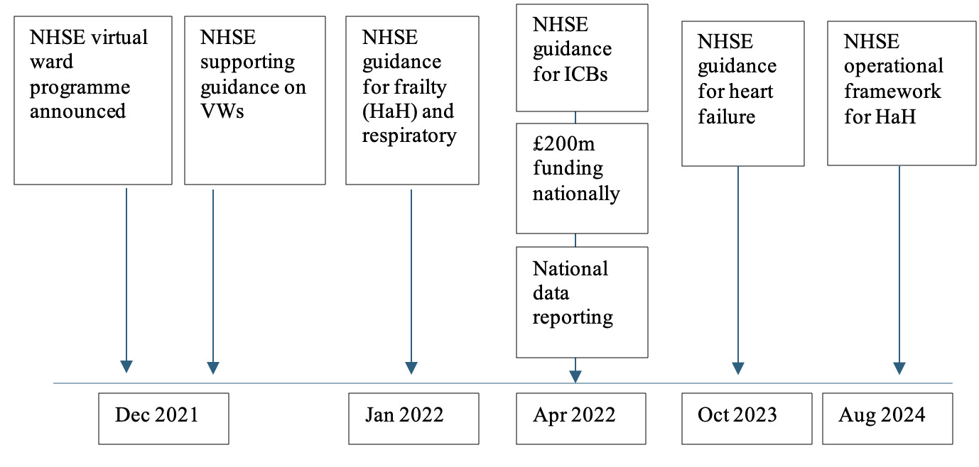 In 2021 NHS England (NHSE) implemented a policy encouraging all Integrated Care Systems (ICSs) to establish ‘virtual ward’ services,3 however little is known about the factors at service level and the wider context that influences implementation. Virtual Wards were initially conceived as a technology-supported remote monitoring system,4 rather than delivering acute multidisciplinary care at home. However, the NHS England 2024 operational framework has renamed these services ‘Hospital at Home’ and changed the specification so that the care model is closer to the internationally recognised HaH definition.5 This change of emphasis, provides a unique opportunity to study the implementation of services at a various of stages of maturity (see Figure 1).